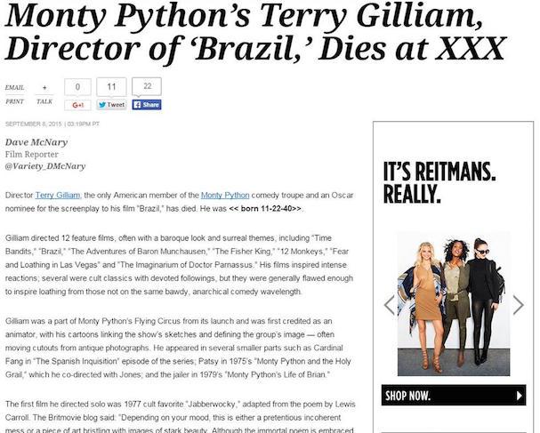 Ακόμα και έγκριτα αμερικάνικα περιοδικά, όπως το «Variety» μπορούν να κάνουν λάθος. Το γνωστό περιοδικό έγραψε ότι ο σκηνοθέτης Τέρι Γκίλιαμ πέθανε. Σύντομα κατάλαβε το λάθος του και «κατέβασε» την δημοσίευση, αλλά ήταν ήδη αργά. Τα social media είχαν πάρει φωτιά. Η είδηση έφτασε και στον μακαρίτη σκηνοθέτη, μέλος των φοβερών Monty Python, ο οποίος απάντησε με χιούμορ.