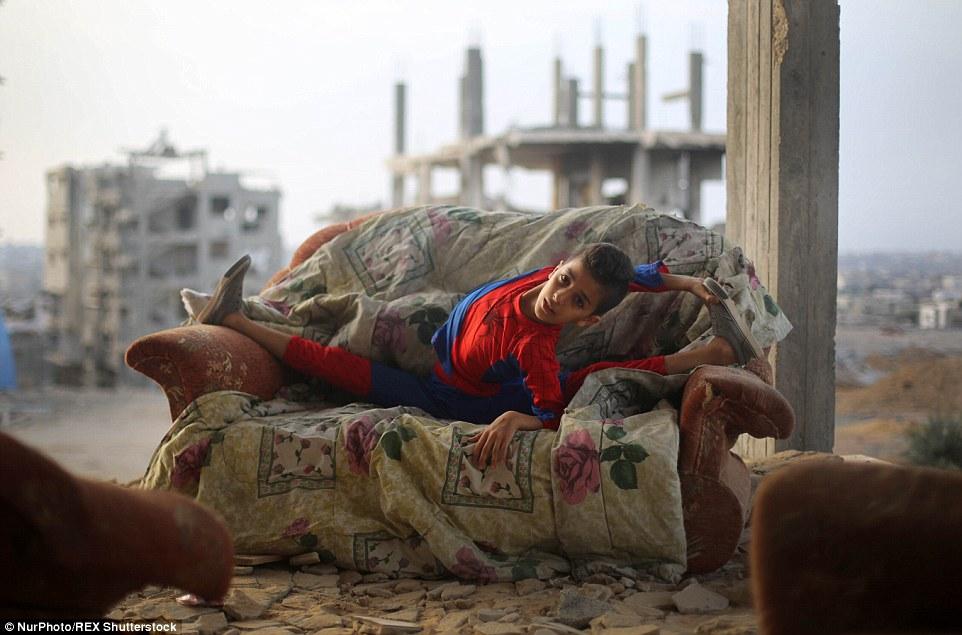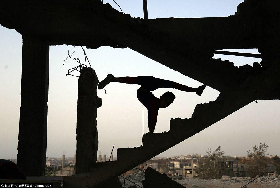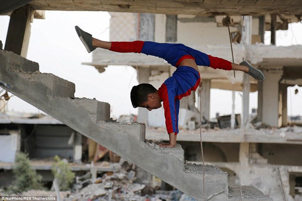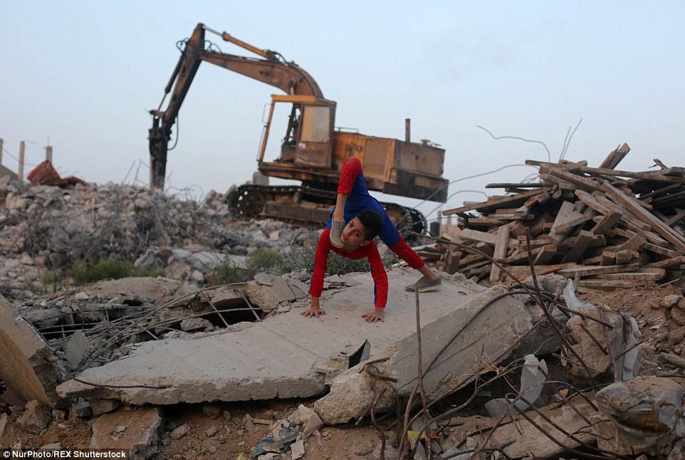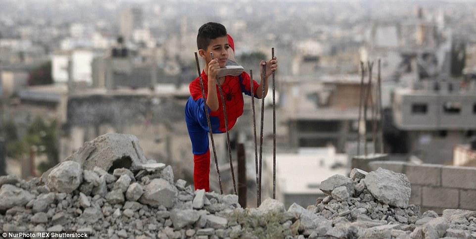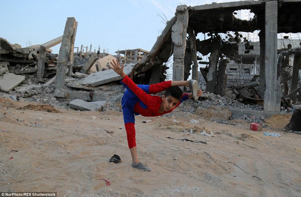 Μια εκπληκτική συλλογή από φωτογραφίες ενός 11χρονου αγοριού την ώρα που επιδεικνύει την ευλυγισία του στα συντρίμμια κτιρίων της Γάζας, φορώντας τη στολή του «Σπάιντερμαν», κάνει τον γύρο του διαδικτύου.