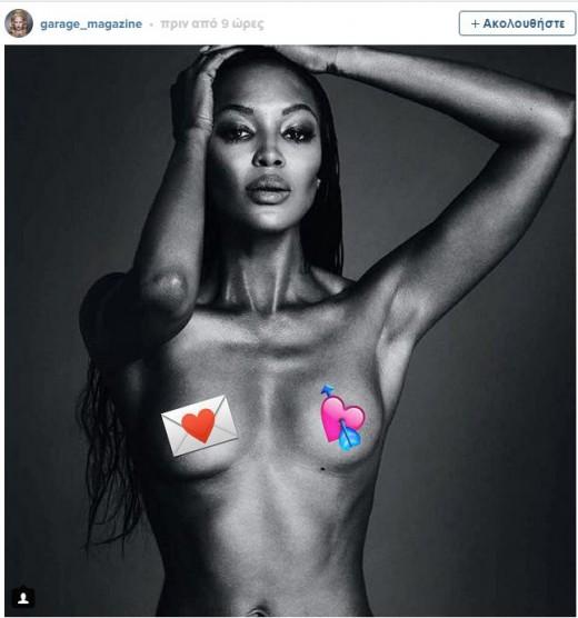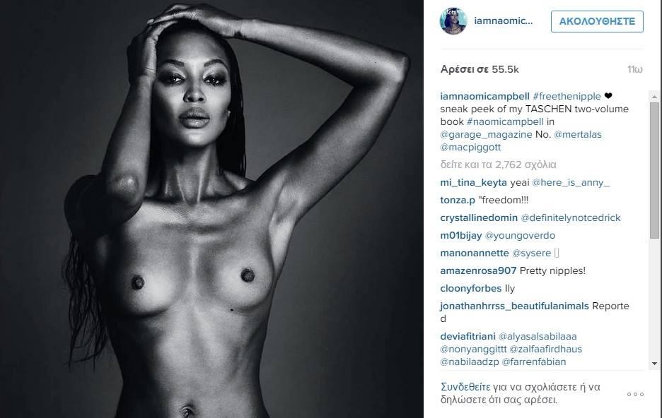 Η Ναόμι Κάμπελ συμμετέχει στο κίνημα «Freethenipple» και δημοσίευσε στον λογαριασμό της στο Instagram μια φωτογραφία όπου είναι γυμνόστηθη.