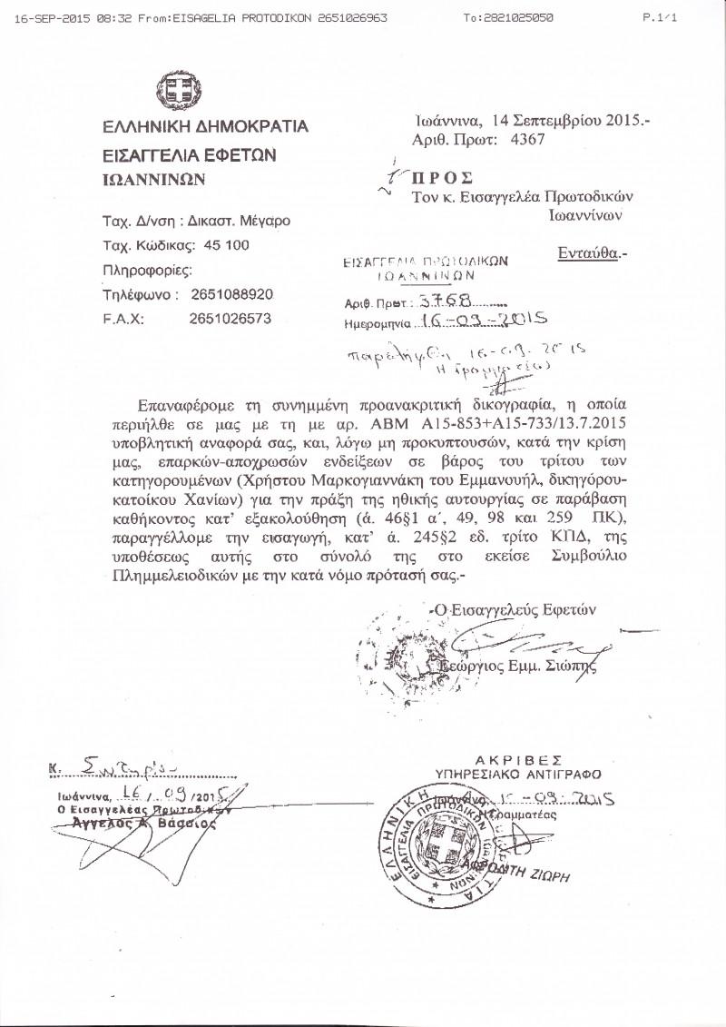 Πλήρως επιβεβαιώνομαι τώρα από την ενέργεια του Εισαγγελέα Εφετών Ιωαννίνων, να επιστρέψει την δικογραφία στον Εισαγγελέα Πλημ/κών με την εντολή να εισαχθεί με πρόταση του στο Δικαστικό Συμβούλιο, αφού δεν προκύπτουν σε βάρος μου, οι κατά νόμο, απαιτούμενες ενδείξεις.
