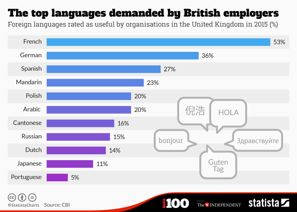 Περισσότεροι από τους μισούς εργοδότες στη Βρετανία, το 53% επιθυμούν από τους υπαλλήλους τους να μιλούν γαλλικά. Στη δεύτερη θέση έρχονται τα γερμανικά με ποσοστό 36%, προφανώς γιατί η Γερμανία ως η μεγαλύτερη οικονομία στην Ευρώπη απορροφά μεγάλο ποσοστό Βρετανικών προϊόντων, στην τρίτη θέση έρχονται τα Ισπανικά και στην τέταρτη θέση ακολουθούν τα κινέζικα.