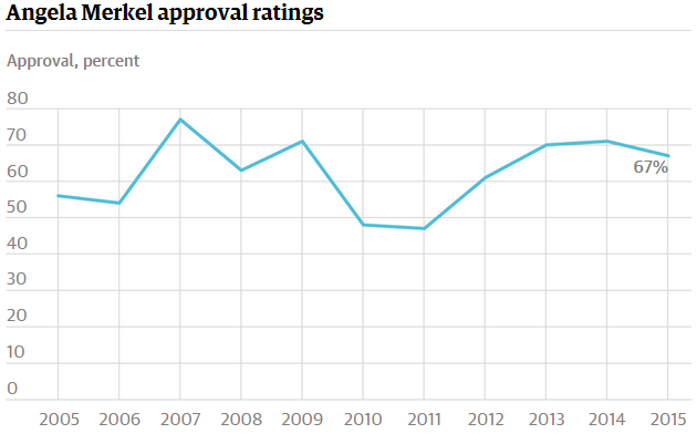 Αν και η Μέρκελ δεν είναι ιδιαίτερα δημοφιλής εκτός Γερμανίας, η αποδοχή της στη χώρα της παραμένει επίμονα υψηλή. Πέφτοντας κάτω από το 50% μόνο ανάμεσα στο 2010 και 2011, όπου η Γερμανία επηρεάστηκε από την παγκόσμια οικονομική κρίση και τα πρώτα πακέτα διάσωσης, σήμερα βρίσκεται και πάλι στα ύψη.