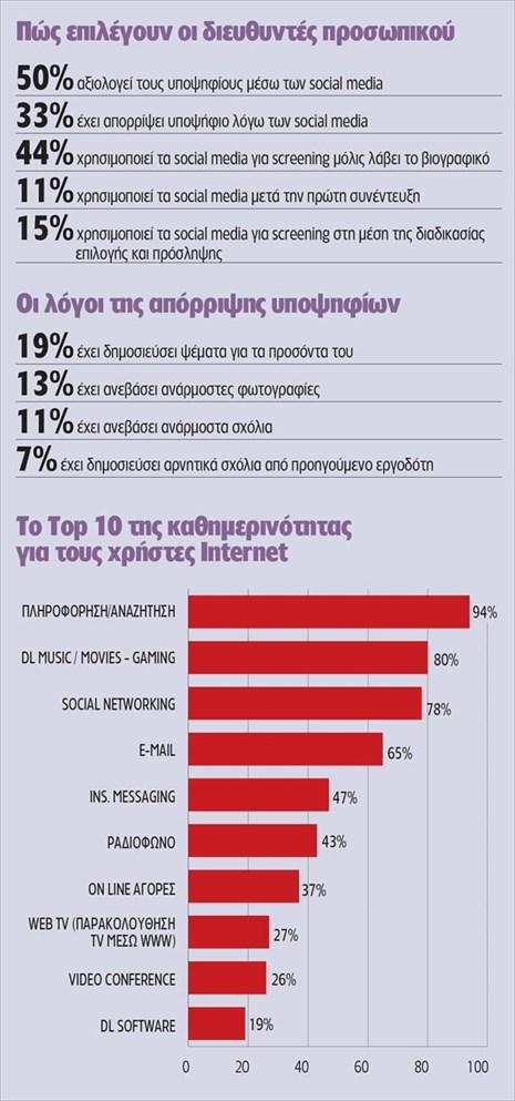 Ένας στους δύο διευθυντές προσωπικού, μόλις λάβει ένα βιογραφικό, χρησιμοποιεί τα μέσα κοινωνικής δικτύωσης για να «ερευνήσει» το ποιόν του υποψήφιου εργαζόμενου, ενώ 1 στους 3 έχει απορρίψει υποψήφιο λόγω της διαδικτυακής συμπεριφοράς του.