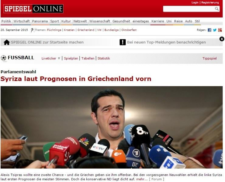«Μπροστά ο ΣΥΡΙΖΑ σύμφωνα με τα προγνωστικά», επιγράφεται σχετικό άρθρο στην ηλεκτρονική έκδοση του Spiegel που σημειώνει: «Ο Αλέξης Τσίπρας ήθελε μια δεύτερη ευκαιρία και οι Έλληνες προφανώς του τη δίνουν. Σύμφωνα με τα πρώτα προγνωστικά, στις πρόωρες εκλογές το αριστερό κόμμα ΣΥΡΙΖΑ έλαβε τις περισσότερες ψήφους. Η συντηρητική Ν.Δ. όμως ακολουθεί σε απόσταση αναπνοής».