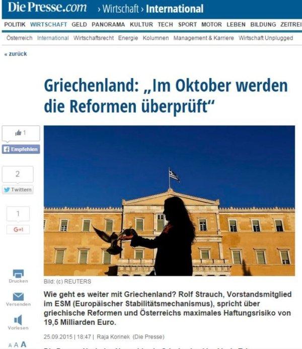 Σε συνέντευξή του στην αυστριακή εφημερίδα «Die Presse», το μέλος του ΔΣ του Μηχανισμού, Ρολφ Στράουx (Rolf Strauch) μέλος του Διοικητικού Συμβουλίου του Ευρωπαϊκού Μηχανισμού Στήριξης (ESM) προειδοποιεί μάλιστα ότι εντός του Οκτωβρίου πρέπει να ολοκληρωθεί η πρώτη αξιολόγηση, η οποία προβλέπει ότι οι αλλαγές στις συντάξεις πρέπει ήδη να έχουν εφαρμοστεί.