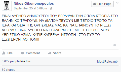 Ο νεαρός τραγουδιστής έγραψε στη σελίδα του στο Facebook: «Είναι λυπηρό δημιουργοί που έγραψαν την όποια ιστορία στο ελληνικό τραγούδι, να διαπομπεύουν με τέτοιο τρόπο τα ιερά και όσια της θρησκείας μας και να επαινούν τον έξω από’ δω. Είναι λυπηρό να επανέρχεστε με τέτοιου είδους υβριστικό άσμα κύριε Καρβέλα. Ντροπή… Στο πυρ το εξώτερον, λοιπόν!!!»