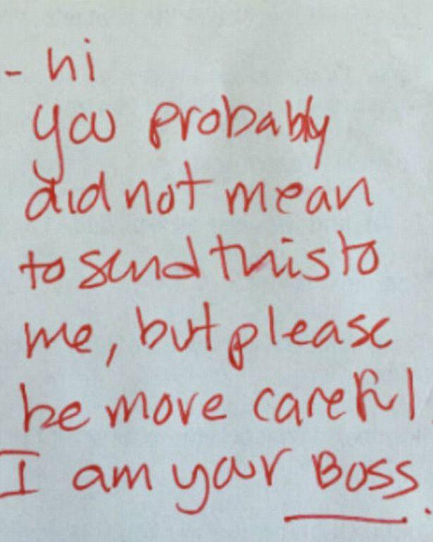 Ο εργοδότης είδε το… ατυχές μήνυμα και απάντησε άμεσα στέλνοντας μια φωτογραφία από ένα χειρόγραφο σημείωμα: «Γεια, πιθανότατα δεν ήθελες να το στείλεις αυτό σε μένα, αλλά σε παρακαλώ να είσαι πιο προσεκτική. Είμαι το ΑΦΕΝΤΙΚΟ σου».