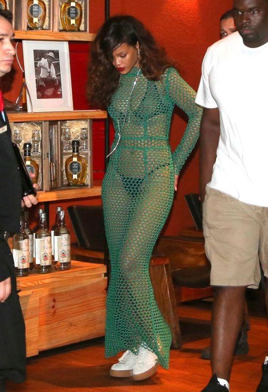 Η γνωστή τραγουδίστρια Ριάννα εμφανίσθηκε με ένα πράσινο δικτυωτό ολόσωμο φόρεμα μέχρι τους αστραγάλους. Από μέσα αποκαλυπτόταν το καλλίγραμμο κορμί της. Το δίχτυ, περισσότερα άφηνε να φανούν, παρά έκρυβε.