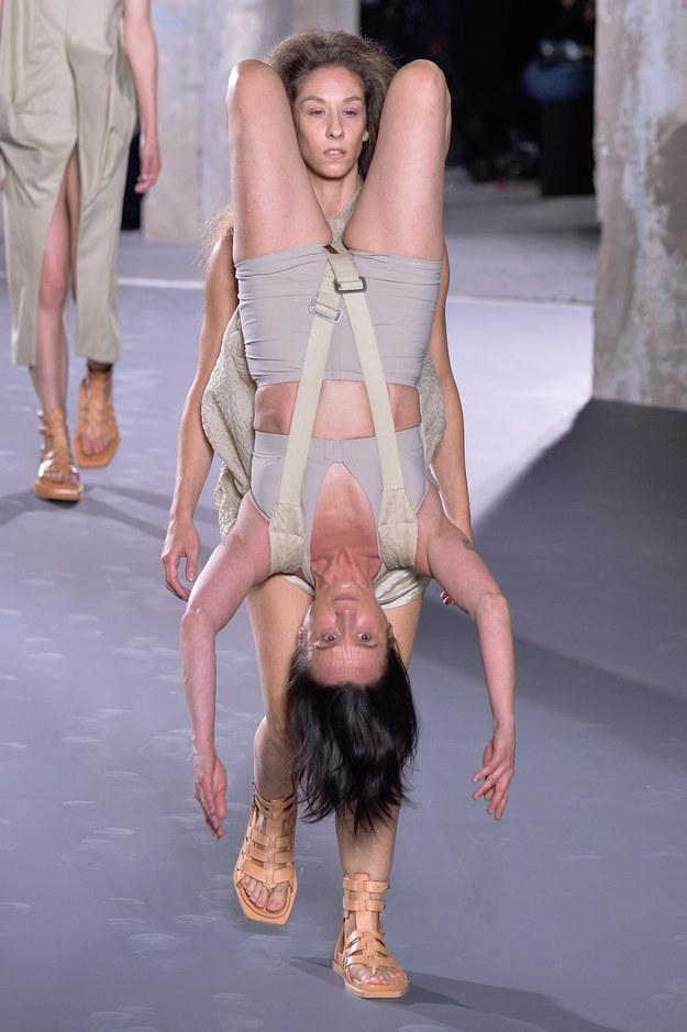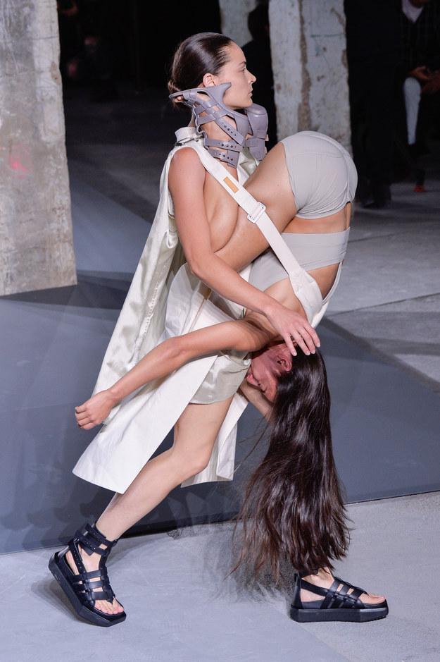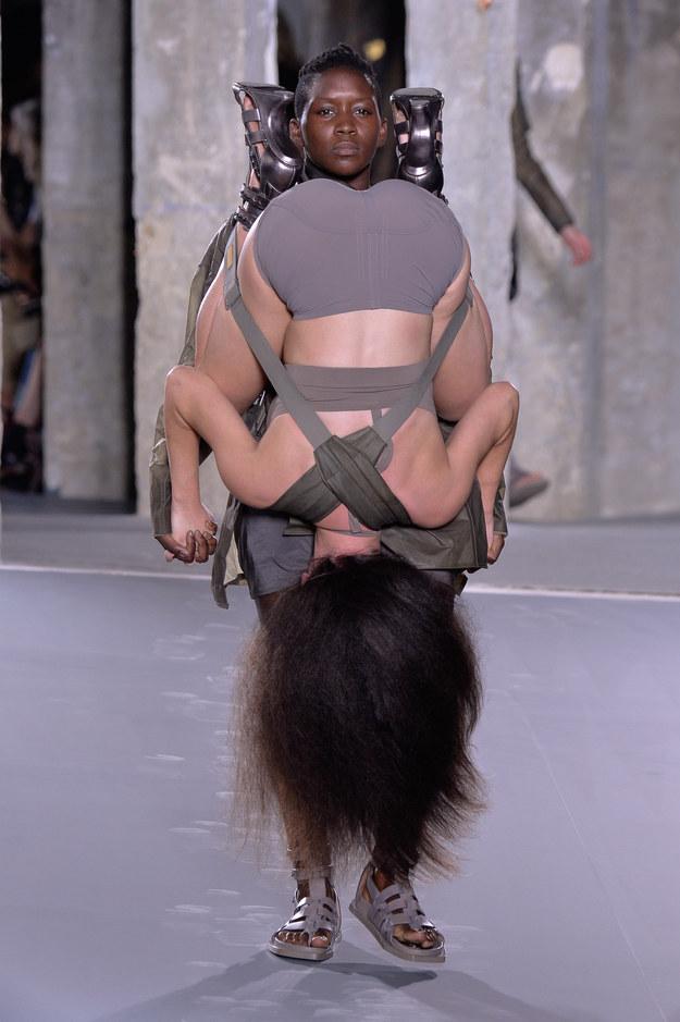 Μοντέλα που κουβαλάν σαν… αξεσουάρ άλλα μοντέλα είδαν οι παρευρισκόμενοι στην πασαρέλα του σχεδιαστή υψηλής ραπτικής, Ρικ Όουενς, στο Palais de Tokyo, στο Παρίσι την Πέμπτη.