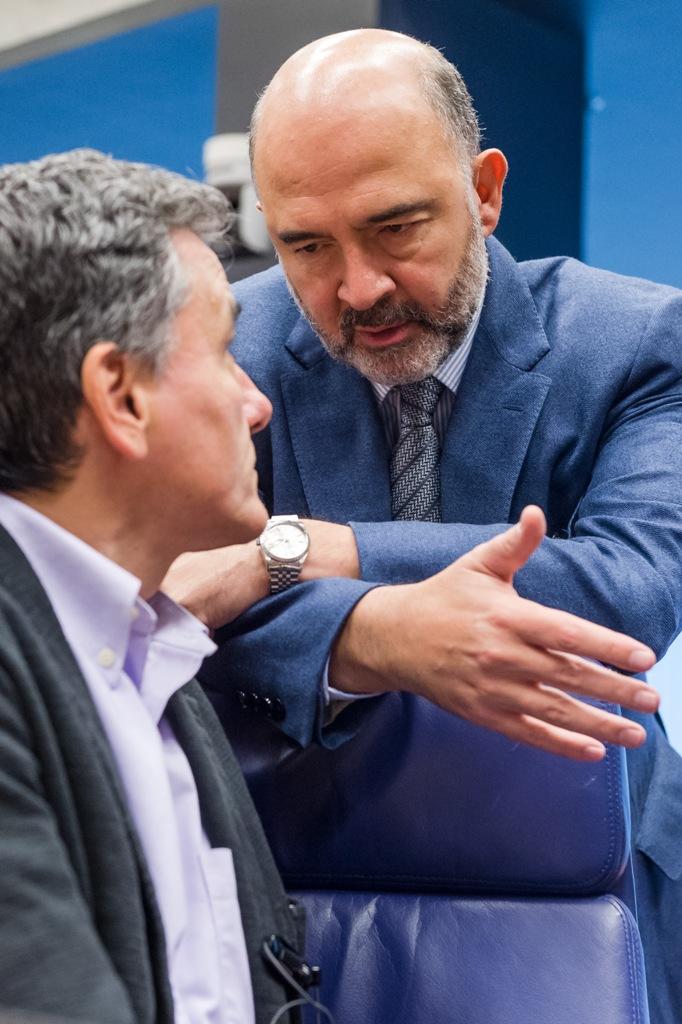 Συνομιλία σε χαλαρό κλίμα είχαν συνομιλία πριν την έναρξη του Eurogroup, ο υπουργός και ο αναπληρωτής υπουργός Οικονομικών Ευκλείδης Τσακαλώτος και Γιώργος Χουλιαράκης, με τον επίτροπο των οικονομικών υποθέσεων της Κομισιόν, Πιερ Μοσκοβισί.