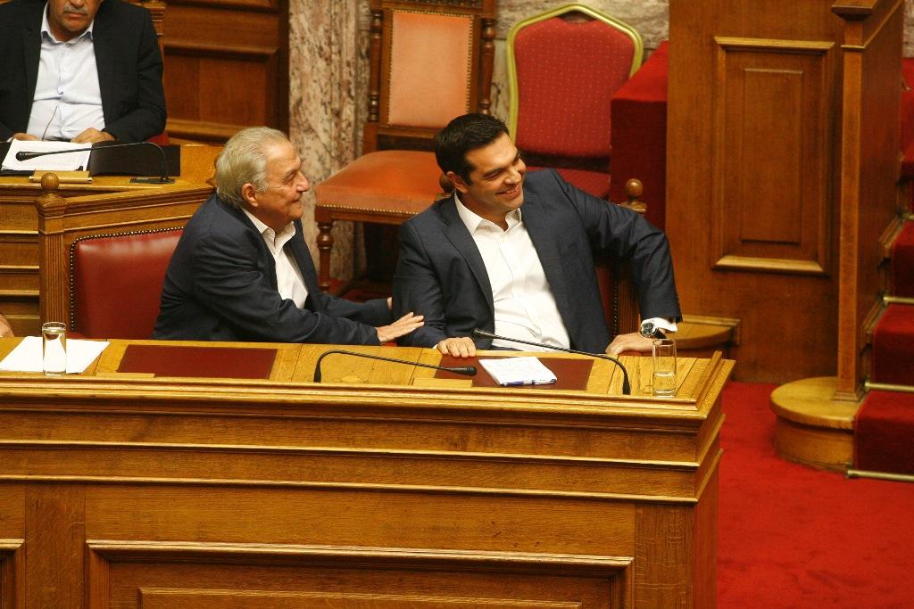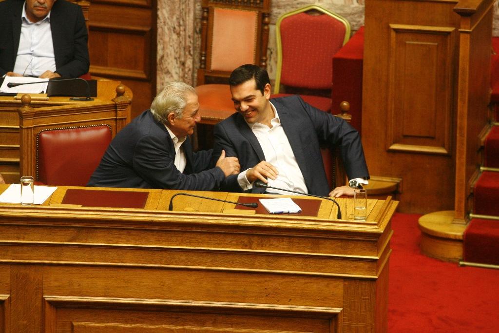 Ελάχιστες στιγμές είχαν περάσει από το άγριο «τζαρτζάρισμα» του Αλέξη Τσίπρα και του Βαγγέλη ΜεΪμαράκη. Ο φωτογραφικός φακός εστίασε στα υπουργικά έδρανα και «συνέλαβε» τον υπουργό Επικρατείας Αλέκο Φλαμπουράρη να «μαγκώνει» από το μπράτσο τον πρωθυπουργό και να του ψιθυρίζει κάτι χαμογελαστός και τον πρωθυπουργό να χαμογελάει με ικανοποίηση…