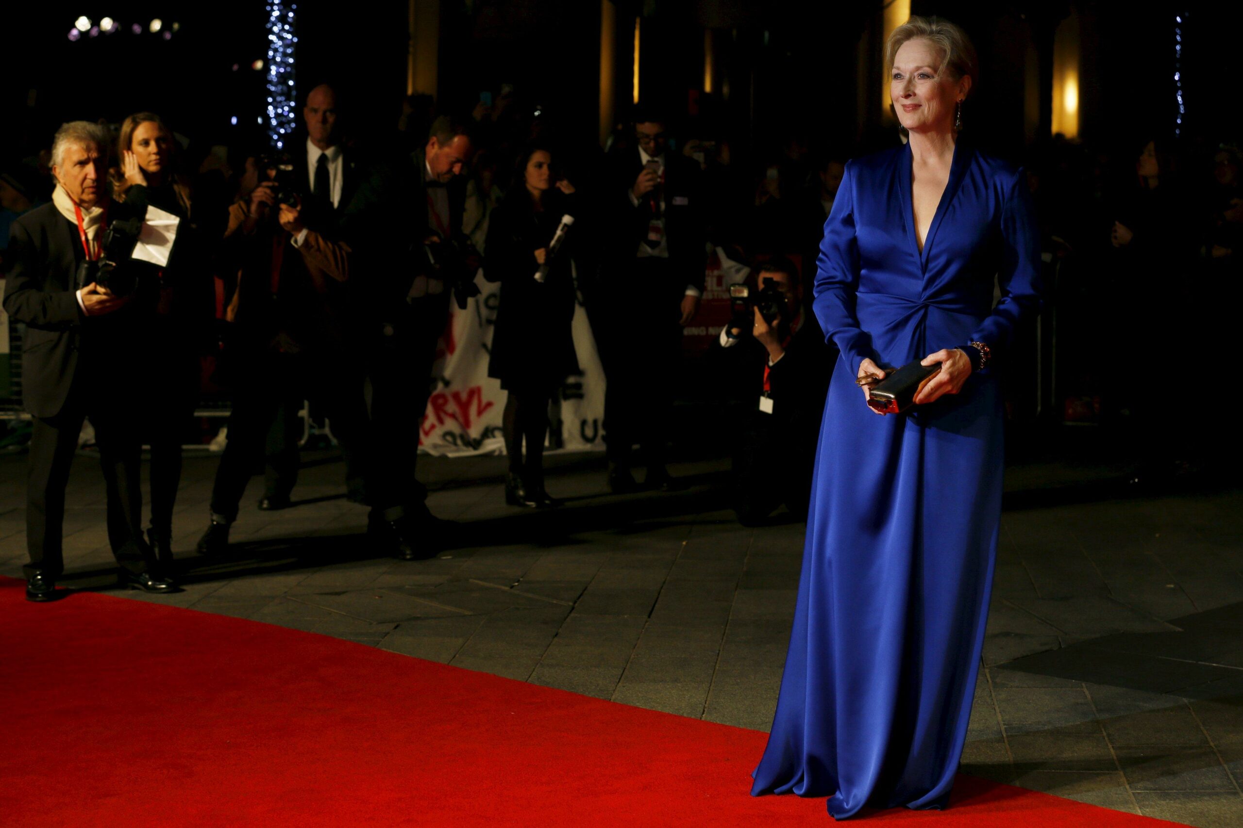 Η Μέριλ Στριπ πόζαρε στον φωτογραφικό φακό, ενώ από πίσω της φαίνονται τα πανό των διαδηλωτριών.