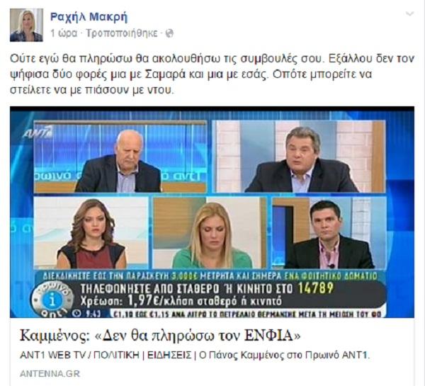 Ειδικότερα η Ρ. Μακρή έχει αναρτήσει ένα βίντεο από συνέντευξη που είχε παραχωρήσει το Σεπτέμβριο του 2014 ο Πάνος Καμμένος στον τηλεοπτικό σταθμό ΑΝΤ1 όπου ανέφερε ότι δεν θα πληρώσει τον ΕΝΦΙΑ.