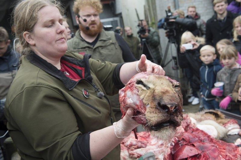Σήμερα, περίπου 300-400 επισκέπτες κάθε ηλικίας συγκεντρώθηκαν για να παρακολουθήσουν την “ανατομία” του λιονταριού. Ένας υπάλληλος, ο Ράσμους Κόλιντ, άρχισε να τεμαχίζει το ζώο υπό τα βλέμματα του κοινού. Πολλοί ήταν αυτοί πάντως που έκλεισαν τις μύτες τους με τα δάχτυλα, μην αντέχοντας την οσμή του πτώματος.