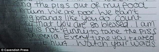 Το κορίτσι στο σημείωμα που άφησε κατηγορούσε τις συμμαθήτριές της ότι την κορόιδευαν για την ανορεξία αλλά και για την οικονομική κατάσταση της οικογένειάς της.