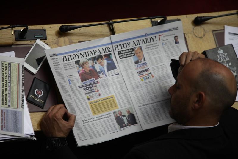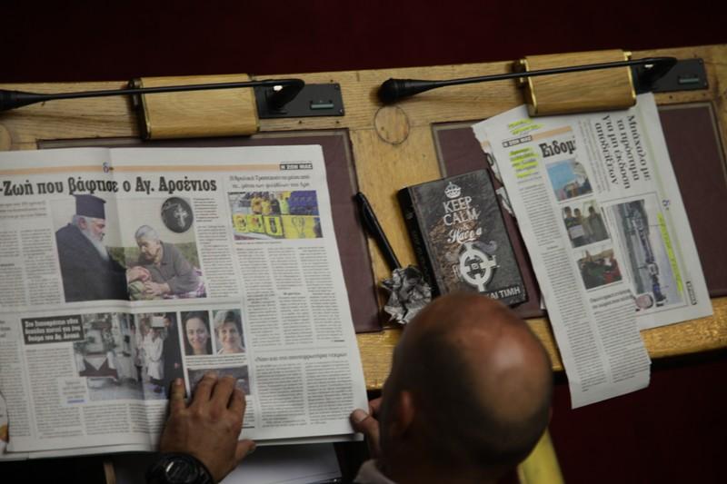 Οι φωτογραφίες από τα βουλευτικά έδρανα της Χρυσής Αυγής, δείχνουν τρεις βουλευτές του κόμματος (διακρίνονται καθαρά Μίχος, Παναγιώταρος και ένας ακόμη) να ξεφυλλίζουν ένα περιοδικό με όπλα κατά τη διάρκεια της συζήτησης του Πολυνομοσχεδίου για τα προαπαιτούμενα, στη Βουλή.