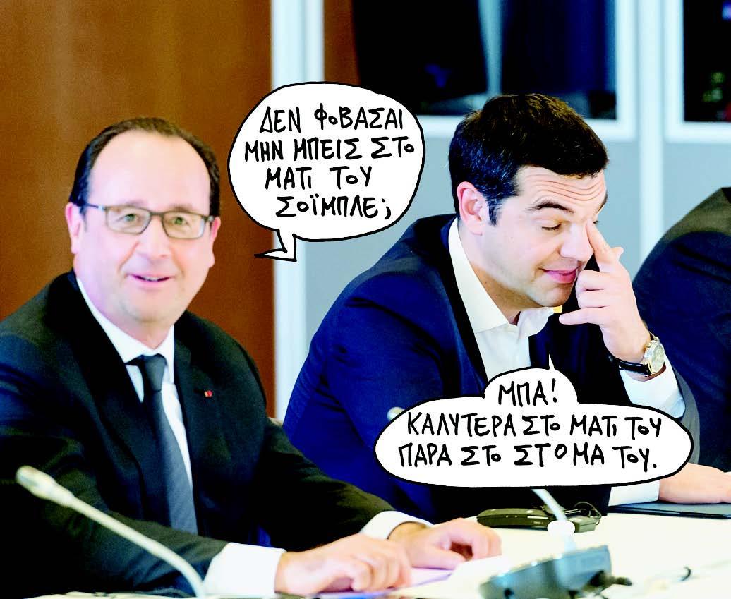 Η κυβέρνηση ελπίζει σε μια επικοινωνιακή ανάσα από την επίσκεψη Ολάντ (το επίσημο πρόγραμμα του Γάλλου προέδρου ξεδιπλώνεται από σήμερα το απόγευμα έως αύριο το απόγευμα) καθώς αναμένεται μια υποστηρικτική δήλωση για τη ρύθμιση του χρέους. Σήμερα – κι ενώ θα τρέχουν οι επαφές των υπουργών με τους εκπροσώπους των θεσμών – συγκαλείται Υπουργικό Συμβούλιο υπό τον πρωθυπουργό για τα κρίσιμα θέματα που είναι ανοιχτά στο τραπέζι. Δηλαδή… τα πάντα όλα.