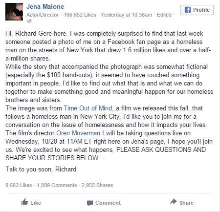 Η συγκεκριμένη φωτογραφία που υποτίθεται είχε αναρτήσει ο ηθοποιός και έγινε viral είναι πραγματική αλλά προέρχεται από τα γυρίσματα της νέας του ταινίας, «Time Out of Mind». Σύμφωνα με την ψεύτικη ανάρτηση πέρασε μία μέρα στην πόλη ως άστεγος και αντιμετώπισε την περιφρόνηση των συμπολιτών του.