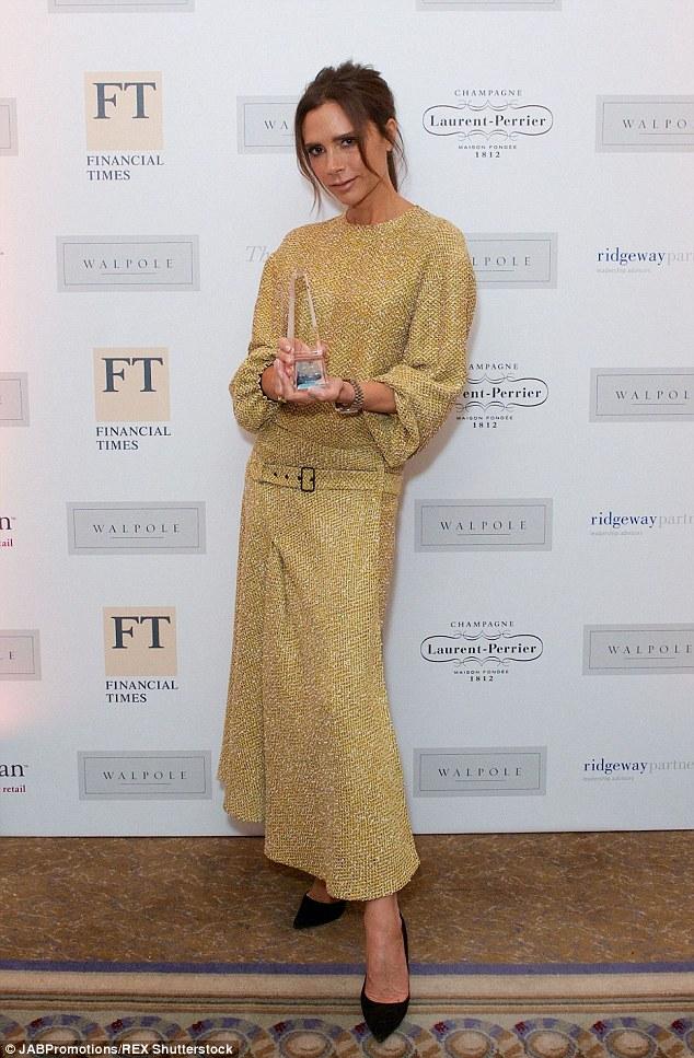 Την Δευτέρα το βράδυ η Βικτόρια στην απονομή των British Luxury Awards που έγιναν στο Ντόρτσεστερ, κέρδισε το βραβείο Luxury Brand of the Year. Και στην απονομή φόρεσε ένα μακρύ χρυσό φόρεμα από τη δική της συλλογή.