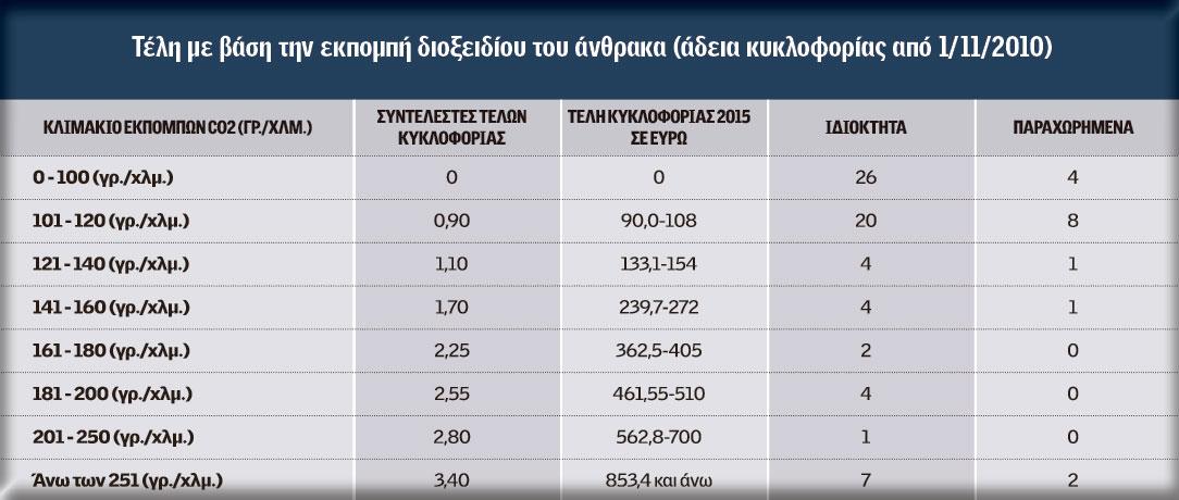 Στα σχέδια του υπουργείου είναι να τροποποιηθούν προς τα πάνω και οι συντελεστές για τα τέλη σε αυτοκίνητα που εκλύουν ρύπους από 161 γρ./χλμ και άνω. Αφορούν σε Ι.Χ. νέας αντιρρυπαντικής τεχνολογίας, αλλά με μεγαλύτερους σε κυβισμό κινητήρες και πιο βαριά αμαξώματα. Εκεί προφανώς θα υπάρξουν ανατροπές στα τέλη, χωρίς ωστόσο να είναι σίγουρο το σενάριο.