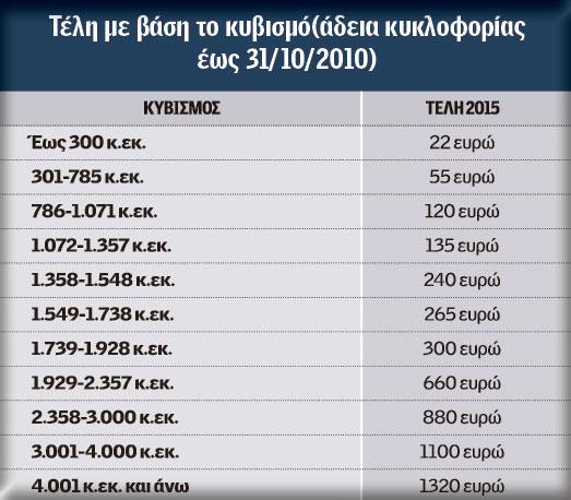 Στις μικρότερες κατηγορίες, και μέχρι τα 1.548 κ.εκ. (τέλη από 22-240 ευρώ), αναμένεται να υπάρξουν μικρές μειώσεις (από 5-20 ευρώ), που θα… προκύψουν από αντίστοιχη αύξηση στα τέλη στις κατηγορίες από 1.549-1.738 κ.εκ. και 1.739 κ.εκ.-1.928 κ.εκ. Εκεί η μέση επιβάρυνση υπολογίζεται στα 50 ευρώ.