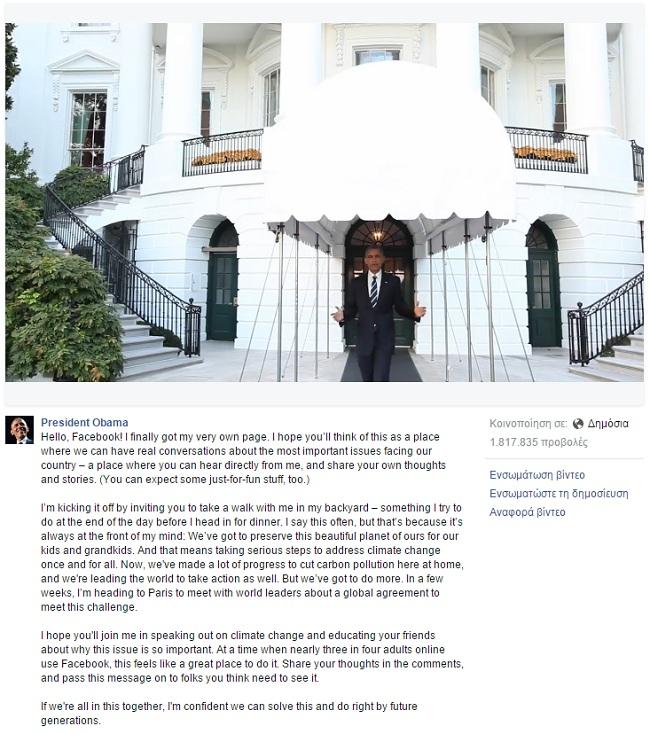 Σε τόνο χαλαρής συζήτησης, ο Ομπάμα μίλησε σε βίντεο που ανάρτησε ως το πρώτο του μήνυμα, για την κλιματική αλλαγή. Περπατώντας στη νότια πλευρά του κήπου του Λευκού Οίκου και θαυμάζοντας την ομορφιά της φύσης, λέει, “Γειά σου, Facebook! Επιτέλους, έχω τη δική μου σελίδα. Την εγκαινιάζω προσκαλώντας σας να με συνοδέψετε σε μια βόλτα μου στην πίσω αυλή του σπιτιού μου – κάτι που προσπαθώ να κάνω στο τέλος της μέρας, πριν πάω για το βραδινό μου φαγητό.”