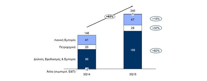 Η σημαντική αύξηση της συνεισφοράς του κλάδου Διύλισης, Εφοδιασμού και Εμπορίας διαμόρφωσε τα αποτελέσματα του Γ’ Τρίμηνου, με τα Συγκρίσιμα Καθαρά Κέρδη να ανέρχονται στα €111 εκατ., έναντι €24 εκατ. πέρυσι, και όλες τις δραστηριότητες να επιτυγχάνουν αύξηση λειτουργικής κερδοφορίας.