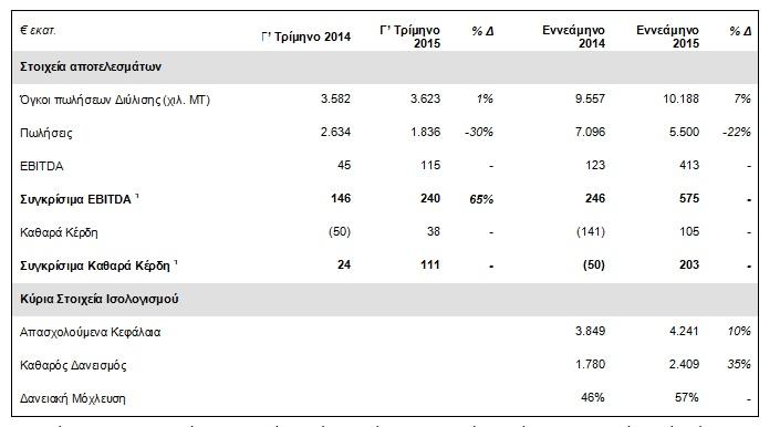 Οι όγκοι πωλήσεων ανήλθαν σε ιστορικά υψηλά στο Γ’ Τρίμηνο 2015 (344 χιλ. τόνοι), λόγω αυξημένης ζήτησης, που ευνοήθηκε από το περιβάλλον χαμηλών διεθνών τιμών και υψηλού βαθμού καθετοποίησης με το διυλιστήριο Θεσσαλονίκης.