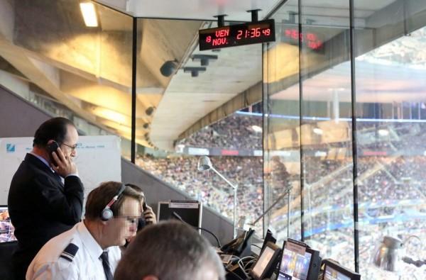 Ώρα Γαλλίας 21:36. Ο Πρόεδρος της Γαλλίας Φρανσουά Ολάντ βρίσκεται στα επίσημα του Stade de France και παρακολουθεί το φιλικό παιχνίδι μεταξύ Γαλλίας και Γερμανίας, όταν χτυπάει το τηλέφωνο για να τον ενημερώσουν για τα τρομοκρατικά «χτυπήματα» στο Παρίσι.