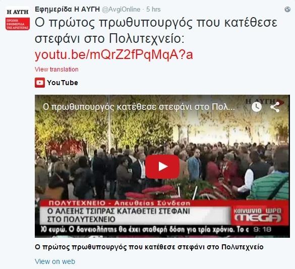 Την έντονη αντίδραση του εκπροσώπου Τύπου του ΠΑΣΟΚ, Παύλου Χρηστίδη, προκάλεσε tweet της «Αυγής», σύμφωνα με το οποίο ο Αλέξης Τσίπρας ήταν ο πρώτος πρωθυπουργός που κατέθεσε στεφάνι στο Πολυτεχνείο.