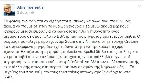«Το φαινόμενο φαίνεται να εξελίσσεται φυσιολογικά αλλά είναι πολύ νωρίς ακόμα να πούμε ότι ήταν το κυρίως γεγονός. Περιμένω ακόμα μερικούς ισχυρούς μετασεισμούς για να ελαχιστοποιηθεί η πιθανότητα ενός μεγαλύτερου σεισμού. Όλο το ΒΒΑ τμήμα του ρήγματος έχει ενεργοποιηθεί. Ο σεισμός προκάλεσε μικρό τσουνάμι 20cm στην Ν. Ιταλία στη περιοχή Crotone. Το συγκεκριμένο ρήγμα δεν έχει η δυνατότητα να προκαλέσει ισχυρά τσουναμι. Ελπίζω αυτή τη φορά η πολιτεία να βρεθεί δίπλα στους πολίτες και να μη προβεί σε ανεκπλήρωτες υποσχέσεις ενώ παράλληλα οι γνωστοί περιφερόμενοι μετά από κάθε σεισμό “ειδικοί” να βλέπουν πεδία οικονομικής εκμετάλλευσης όπως στη περίπτωση των σεισμών της Κεφαλλονιάς….. Το μέγεθος του σεισμού μετά τους τελευταίους υπολογισμούς ανέρχεται στα 6.4R».