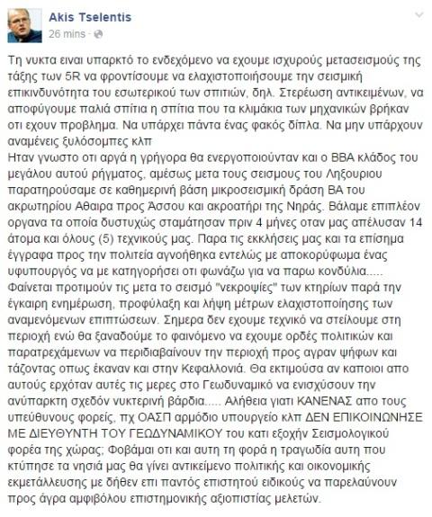 Συγκεκριμένα, ο κ. Τσελέντης έγραψε στο Facebook: