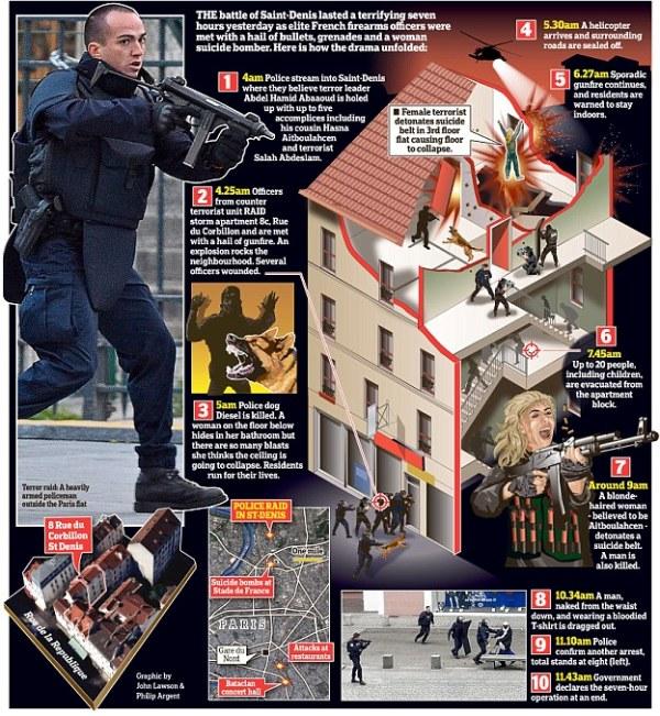 Την ώρα που οι ειδικές δυνάμεις της αστυνομίας εισέβαλλαν στο διαμέρισμα στη συνοικία Σεντ Ντενί, η Hasna, ζωσμένη με εκρηκτικά ούρλιαξε «Κάποιος να με βοηθήσει, βοηθήστε με» και το ζωσμένο με εκρηκτικά γιλέκο της ανατινάχθηκε και διαμέλισε το κορμί της.