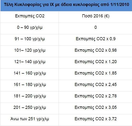 Στο σύστημα τελών κυκλοφορίας εντάσσονται 96.000 αυτοκίνητα που μέχρι σήμερα απαλλάσσονταν από το σύστημα και τέθηκαν σε κυκλοφορία για πρώτη φορά στην Ελλάδα μετά την 30ή Οκτωβρίου 2010 και εκπέμπουν ρύπους από 90 έως και 100 μικρογραμμάρια διοξειδίου του άνθρακα ανά χιλιόμετρο.