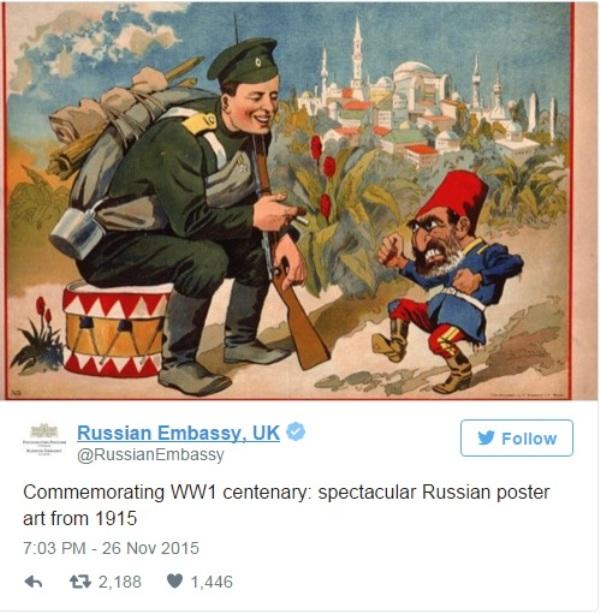 Για παράδειγμα, η πρεσβεία της Ρωσίας στο Ηνωμένο Βασίλειο, ανεβάζει στο twitter, τιτιβίσματα που τρολλάρουν τους Τούρκους, ύστερα από την κατάρριψη του ρωσικού αεροσκάφους.