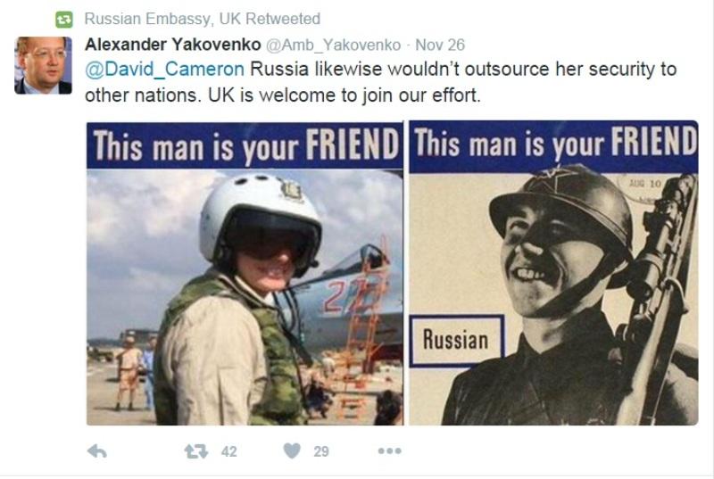 Και ο ίδιος ο πρέσβης συνεχίζει τον γεμάτο νόημα «βομβαρδισμό» στο twitter. Έχει φωτογραφία ενός Σοβιετικού στρατιώτη από τον Β. Παγκόσμιο, η οποία κυκλοφορούσε ευρέως στην Αγγλία και έγραφε «Αυτός ο άνδρας είναι φίλος σας». Στην ίδια φωτογραφία έχει βάλει και έναν σύγχρονο Ρώσο πιλότο με την ίδια ατάκα.