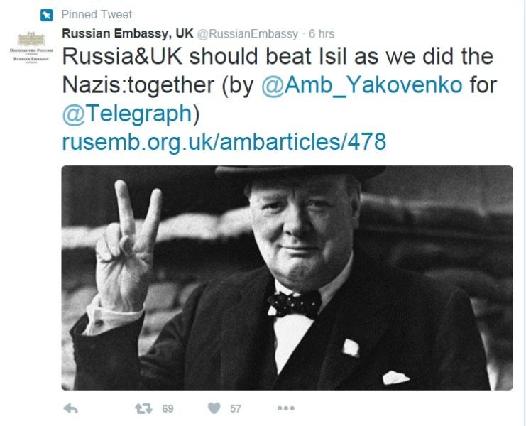Κάτι μάλλον θα θέλουν να πουν οι Ρώσοι στους Τούρκους σχετικά με τη δύναμη των δυο χωρών. Επίσης και ο Ρώσος πρέσβης στο Λονδίνο, Αλεξαντάρ Γιακοβλένκο, έχει ανεβάσει φωτογραφία του Τσώρτσιλ από τον δεύτερο παγκόσμιο πόλεμο που λέει: «Η Ρωσία και η Αγγλία θα πρέπει να νικήσουν το Ισλαμικό Κράτος, όπως έκαναν και με τους ναζί στον Β παγκόσμιο πόλεμο»