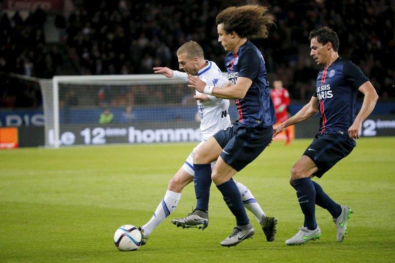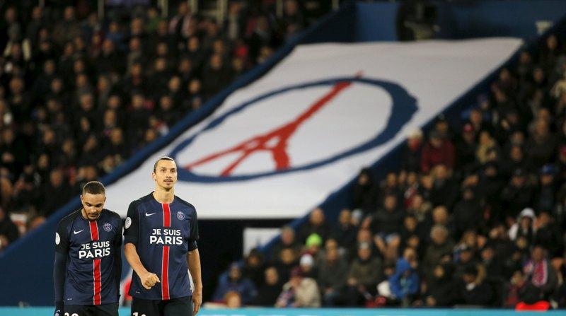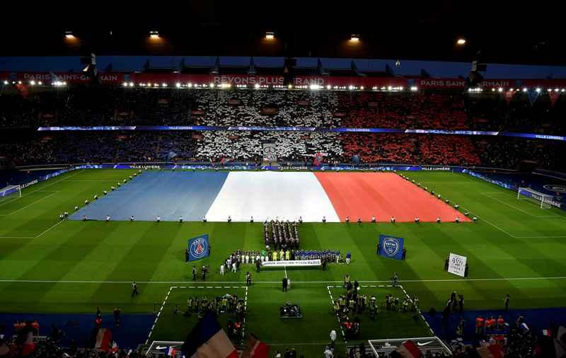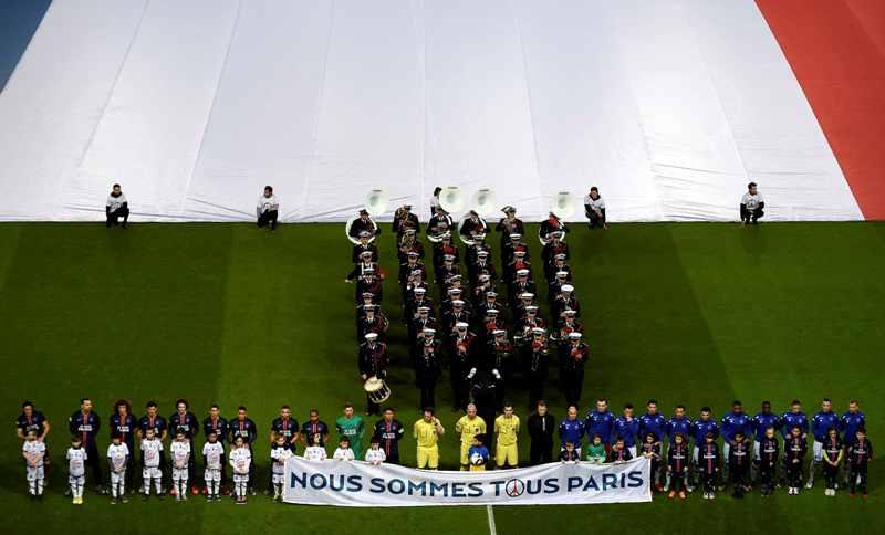Μία τεράστια γαλλική σημαία έχει καλύψει το γήπεδο της Paris St Germain, λίγο πριν από την έναρξη του παιχνιδιού με την Troyes, Οι φίλαθλοι μέσα στο Parc des Princes στο Παρίσι, τηρούν ενός λεπτού σιγή για να τιμήσουν τη μνήμη των θυμάτων των τρομοκρατικών επιθέσεων που συγκλόνισαν τη χώρα και ολόκληρη την Ευρώπη.