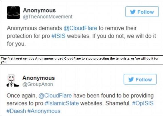 Οι Anonymous κατηγορούν την αμερικανική εταιρεία ότι βοηθάει σελίδες που σχετίζονται με τους τζιχαντιστές να «αποκρούουν» και να προστατεύονται από τις επιθέσεις τους.