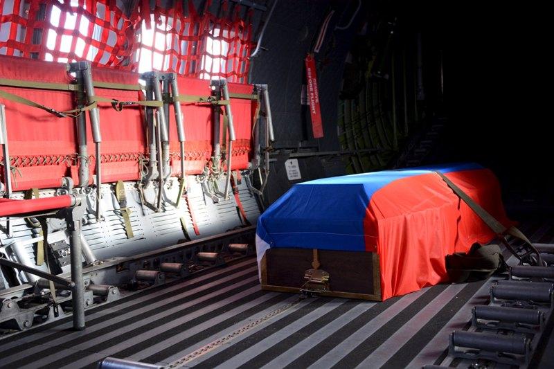 Τη σορό περίμεναν ο Ρώσος υπουργός Άμυνας Σεργκέι Σόιγκου, ο αρχηγός της ρωσικής πολεμικής αεροπορίας Βίκτορ Μποντάρεφ και άγημα που απέδωσε τιμές σε ιδιαίτερα βαρύ κλίμα.