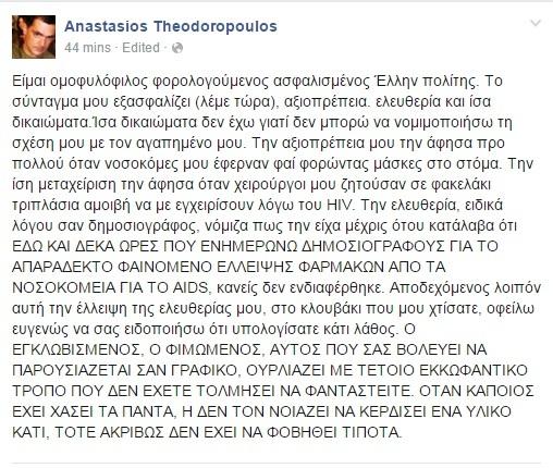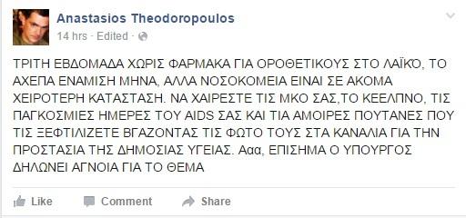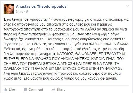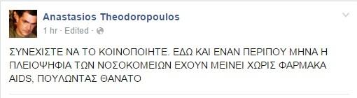 Μήνυμα αγωνίας από τον δημοσιογράφο Τάσο Θεοδωρόπουλο, που με μπαράζ δημοσιεύσεων στον προσωπικό του λογαριασμό στο Facebook αναφέρει ότι έχει διακόψει εδώ και τρεις εβδομάδες την λήψη της αντιρετροϊκής φαρμακευτικής αγωγής του, καθώς το φαρμακείο του “Λαϊκού” έχει εξαντλήσει τα αποθέματά του…