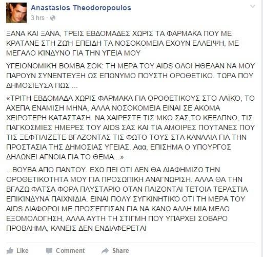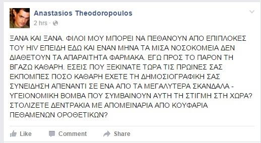 Μήνυμα αγωνίας από τον δημοσιογράφο Τάσο Θεοδωρόπουλο, που με μπαράζ δημοσιεύσεων στον προσωπικό του λογαριασμό στο Facebook αναφέρει ότι έχει διακόψει εδώ και τρεις εβδομάδες την λήψη της αντιρετροϊκής φαρμακευτικής αγωγής του, καθώς το φαρμακείο του νοσοκομείου της Αθήνας “Λαϊκό” έχει εξαντλήσει τα αποθέματά του…