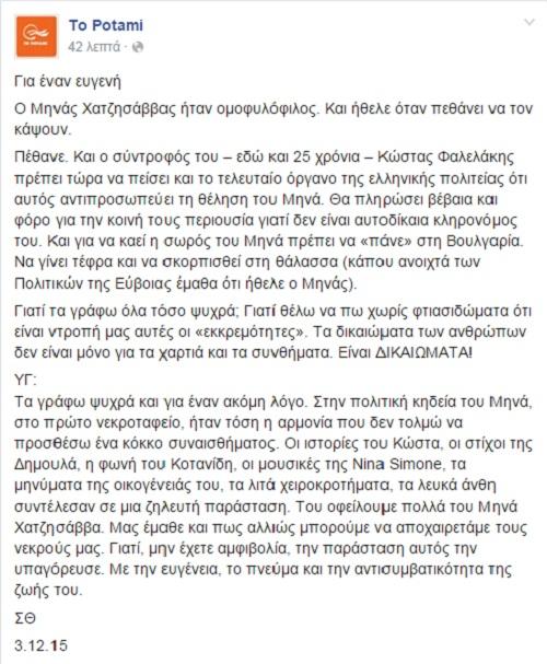 Με μια ανάρτηση του στο λογαριασμό του Ποταμιού στο Facebook ο Σταύρος Θεοδωράκης γράφει για τον θάνατο του Μηνά Χατζησάββα, την επιλογή του να αποτεφρωθεί και τη στάση του συντρόφου του Κώστα Φαλελάκη…