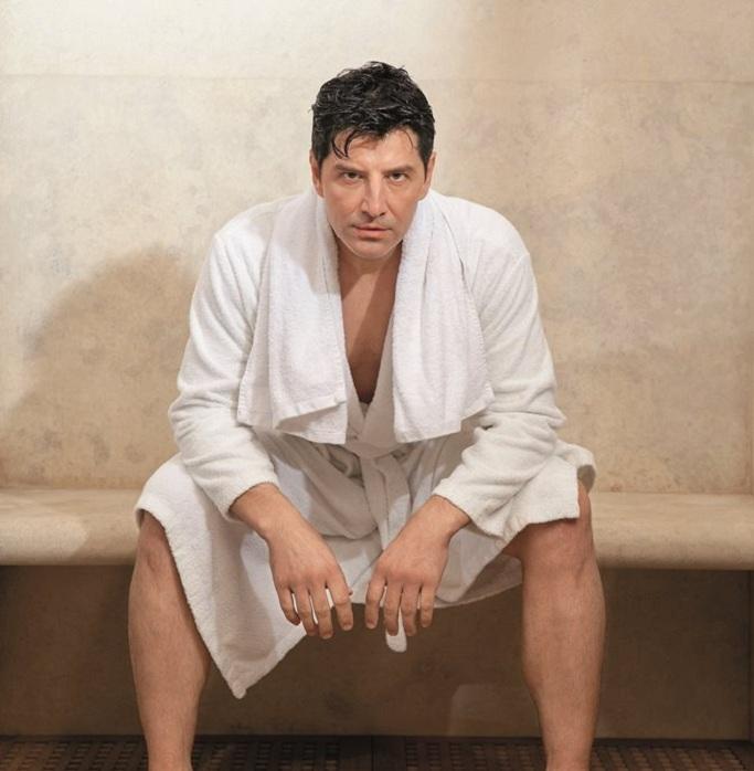 Σε άλλο στιγμιότυπο, ο Σάκης Ρουβάς, ποζάρει φορώντας μόνο ένα μπουρνούζι.