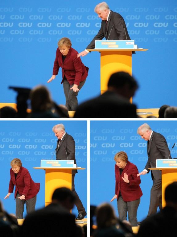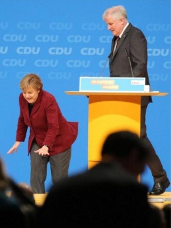 Όλοι κράτησαν τις αναπνοές τους. Ακουγόντουσαν μόνο τα φλας των φωτορεπόρτερ που δούλευαν στο γρήγορο για να απαθανατίσουν την τούμπα που φαινόταν να έρχεται. Η Μέρκελ έφερε τα χέρια της μπροστά και προετοιμάστηκε για την πτώση. Ο επικεφαλής των Βαυαρών Χριστιανοκοινωνιστών, Χορστ Σιχόφερ πετάχτηκε από την έδρα και έσπευσα να την συγκρατήσει.