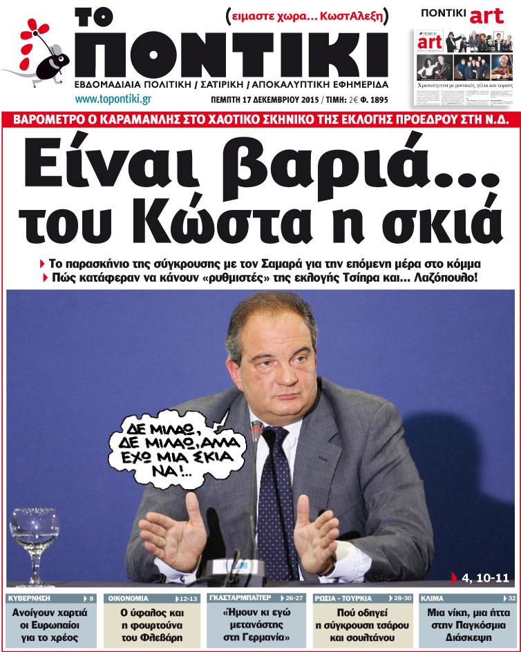 Το «Ποντίκι» κυκλοφορεί την Πέμπτη, 17 Δεκεμβρίου, με πρωτοσέλιδο τίτλο «Είναι βαριά… του Κώστα η σκιά» και αναλυτικό – αποκαλυπτικό ρεπορτάζ για τον σημαντικό ρόλο του Κώστα Καραμανλή στο χαοτικό σκηνικό της εκλογής προέδρου της ΝΔ.
