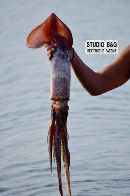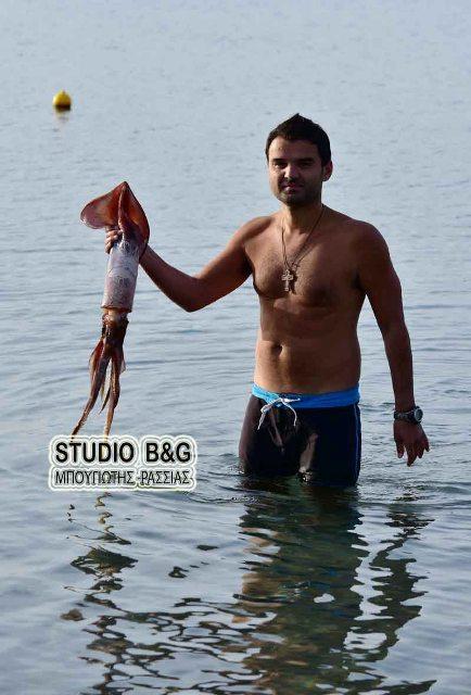 Ένα τεράστιο καλαμάρι έπιασε ο χειμερινός κολυμβητής Δημήτρης Σεφέρογλου στην παραλία Καραθώνας στο Ναύπλιο.