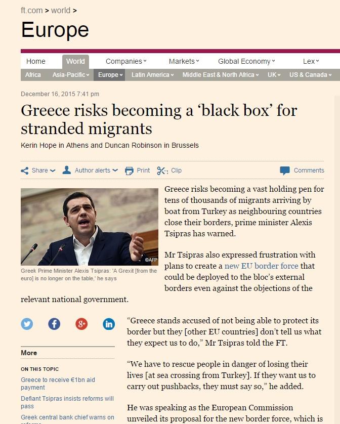 Ο πρωθυπουργός Αλέξης Τσίπρας λίγο πριν τη Σύνοδο Κορυφής, όπου αναμένεται να βρεθεί στο επίκεντρο η προσφυγική κρίση και η διαχείριση της και η μετατροπή του Frontex σε ευρωπαϊκή συνοριοφυλακή και ακτοφυλακή μίλησε στους Financial Times εκφράζοντας τη δυσαρέσκειά του για τις πιέσεις που δέχεται η χώρα από τους Ευρωπαίους εταίρους μας σε ό,τι αφορά το προσφυγικό ζήτημα και τη φύλαξη των συνόρων.