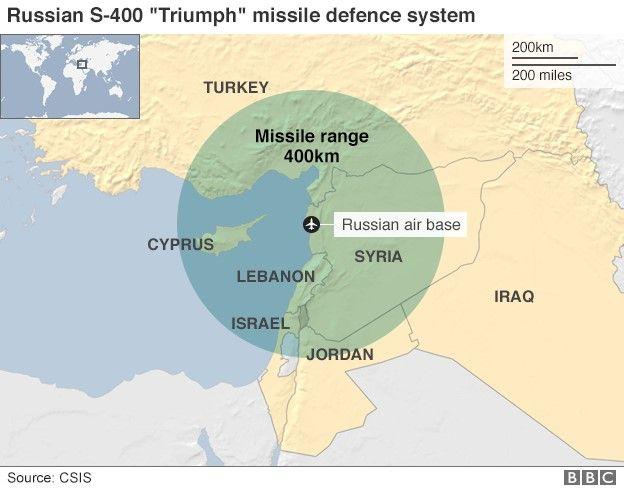 Από τη βάση στη Λατάκεια οι S-400 καλύπτουν σχεδόν ολόκληρη τη Συρία, όλο το Λίβανο, τη βόρεια Ιορδανία και το βόρειο Ισραήλ καθώς και ένα μεγάλο κομμάτι της νότιας Τουρκίας.
