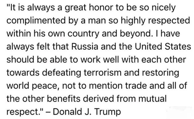Ο Τραμπ απάντησε στον ίδιο φιλικό τόνο, λέγοντας πως «είναι μεγάλη τιμή να δέχομαι τέτοιες φιλοφρονήσεις από έναν ηγέτη τόσο σεβαστό τόσο στο εσωτερικό της χώρας του όσο και στο εξωτερικό.» Επίσης εξέφρασε την πεποίθηση του πως ΗΠΑ και Ρωσία πρέπει να συνεργάζονται πιο στενά ενάντια στην τρομοκρατία.